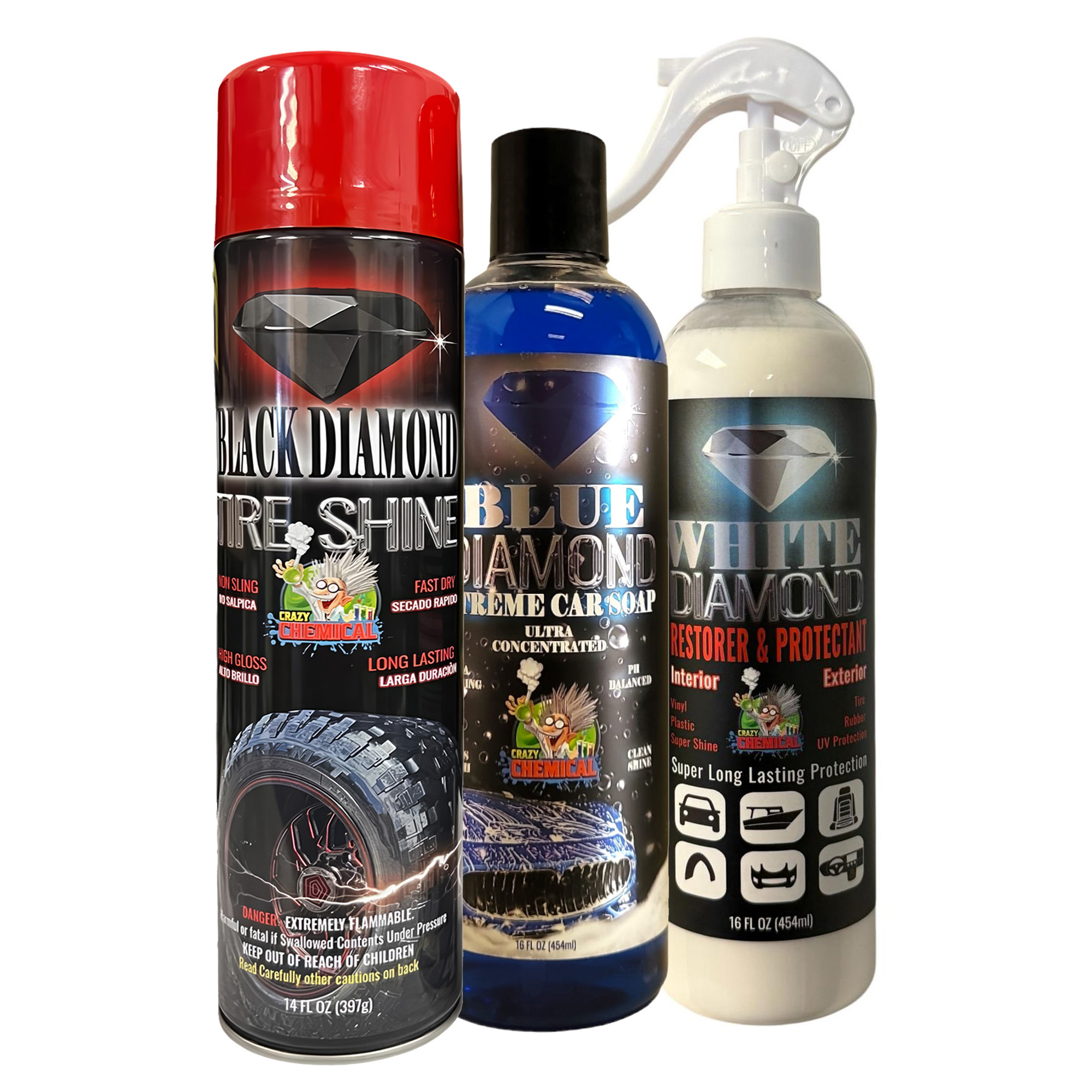 Blue to wash, White to restore & Black Diamond to shine your tires. Everything you need for a perfect finish.